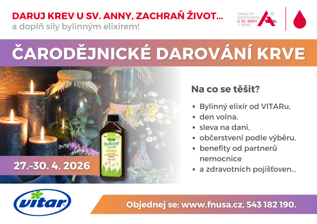 Odběrové centrum Transfuzního oddělení Fakultní nemocnice u sv. Anny v Brně připravilo pro dárce krve a krevní plazmy motivační akci s názvem Čarodějnické darování. Každý dárce, který k odběru přijde ve dnech od 27. do 30. dubna 2026, si kromě dobrého pocitu z pomoci potřebným odnese také bylinný elixír od VITARu, partnera akce.
