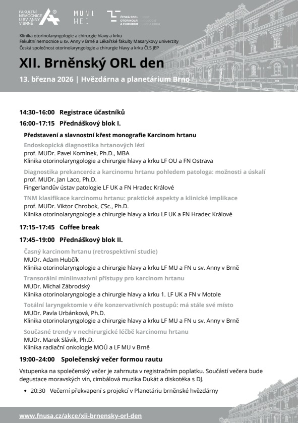Věřím, že i dvanáctý ročník Brněnského ORL dne bude důstojným pokračováním zavedené tradice a vítanou příležitostí k odbornému i přátelskému setkání.